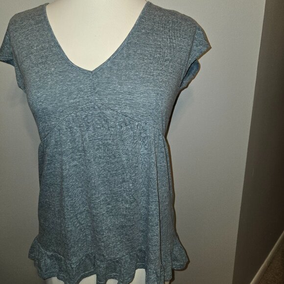 Listicle short sleeve tunic top with a tie in the back and ruffle detail on the bottom. Women's size: M