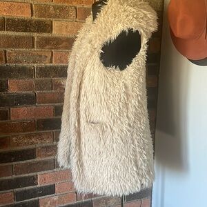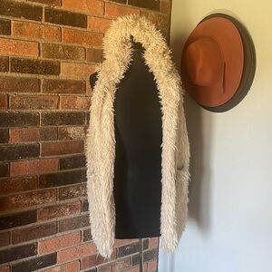 Chic and warm beige furry outerwear by Listicle. Ideal for cozy layering with pockets and hood