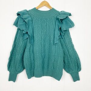 Listicle Sweater Women's Size Small Teal Green Cable Knit Puff Sleeve Ruffles