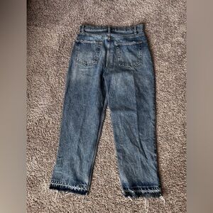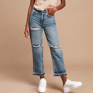 The Free People Lita Light Wash Distressed High Waisted Slim Leg Jeans are here to save your denim collection from boredom! These ultra-cool jeans (in Free People's Yosemite Blue wash) are formed by sturdy denim that creates a trendy high-waisted fit, a five pocket cut and belt loops, and a branded top button/hidden zip fly. Slim fit legs have lived-in fading and distressing throughout before ending at raw hems with side notches.