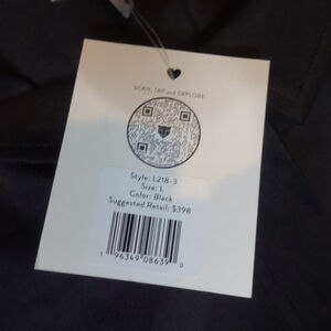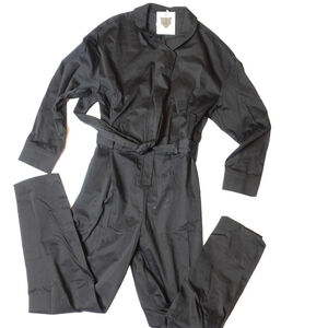 This is a women's black LITA jumpsuit, style L218-3, size L, with a suggested retail price of $398. The jumpsuit is made of 97% cotton and 3% elastain . It features a zip front closure, a self-tie belt, long sleeves with buttoned cuffs, and two welt pockets at the hips. measurement : see pictures. New With Tag