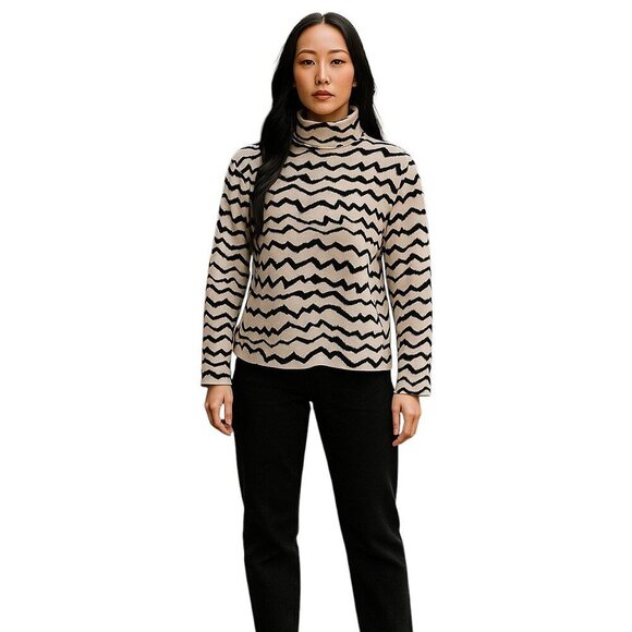 The Lita by Ciara Merino Wool Sweater Pullover in size L features a stylishprint pattern in black and white, perfect for a casual occasion. This tight-knit sweater has a mock neck and long sleeves for added warmth during the winter and fall seasons. Made from a blend of nylon, spandex, and wool, this sweater offers a comfortable fit with a regular style. The 22" length and 19" pit to pit measurement make it a versatile and fashionable choice for women looking to add a trendy touch to their wardrobe.