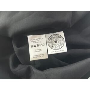 Fully lined. Hidden back zipper closure. Padded shoulders. Plunging neckline. Lightweight crepe fabric with notched hem