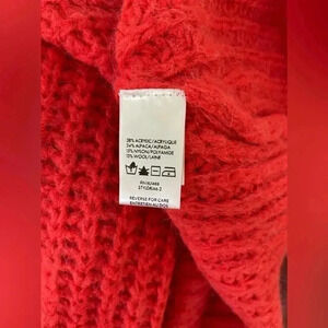 Features a vibrant red/orange color with a very cool knit design, almost a cowl neck style, easily cover the ears if needed. Women’s M, very oversized!