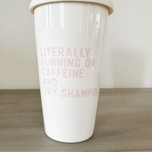 Literally Running on Caffeine and Dry Shampoo White Pink Ceramic Coffee Travel Mug with flexible silicone removable lid. White mug with pale pink lettering. Great condition, just have too many mugs.