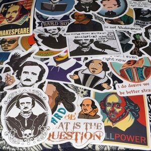 Vibrant stickers featuring iconic literary figures: Shakespeare and Poe. Ideal for personalizing notebooks and laptops. You will receive 15 assorted stickers.