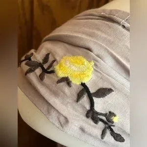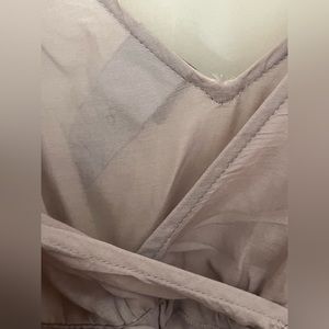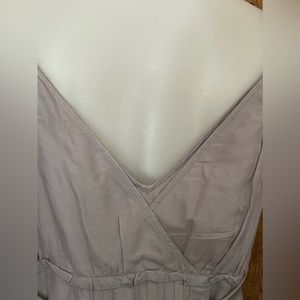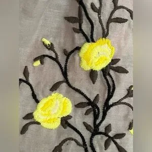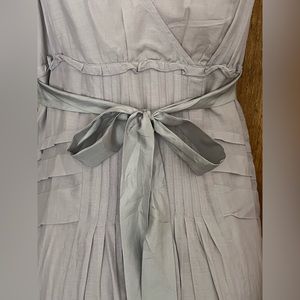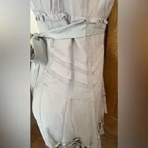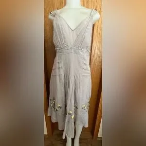 Pre-owned Lithe Sleeveless Dress. Dress is lined. Zips up on the side. Embroidered flowers at bottom and at shoulders. Ties in the back. Made of 68% Cotton & 33% Silk. Arm pit to arm pit across the chest measures 18”. Women’s size 8.