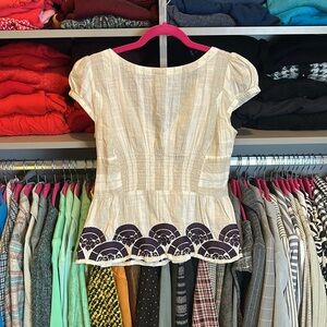Lithe tan/white/aubergine cap sleeve side zipper smocked back top size 4
