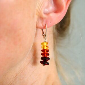 These Baltic amber earrings feature a vertical drop design with naturally multicolored amber beads. Graduated tones move from honey to cognac and deep cherry, creating subtle variation and movement. Finished with solid sterling silver leverback closures, these Baltic amber earrings feel light, balanced, and easy to wear.