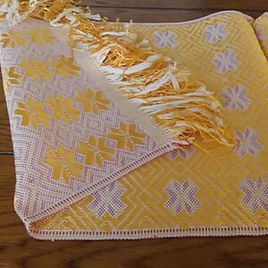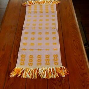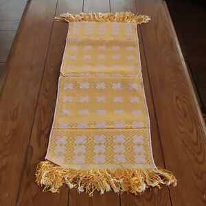 Beautiful woven linen table runner from Eastern European country, Lithuania. It is gold with cream.The gold threads look silky. Measures 3 feet long and 1 foot wide. New never used.
