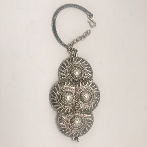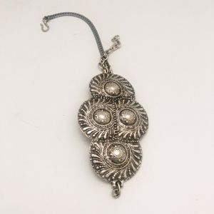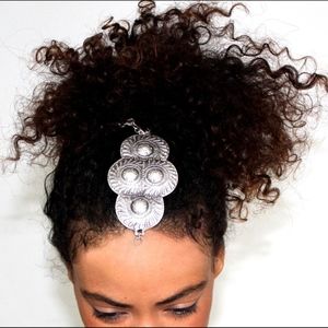 Substantial shield of sterling silver has a snap in comb holding it secure onto the front of the head and a snake chain that loops around the bun or ponytail, and hooks to adjustable chain lengths.Made from sterling silver and brass. One size. Handmade in USA.