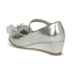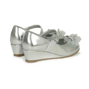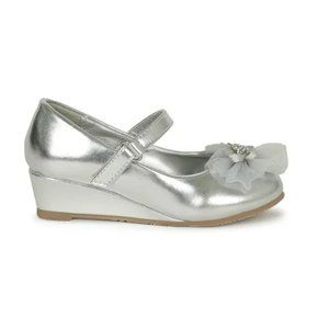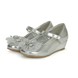 Little/ Big Girls Round Toe Rhinestone Chiffon Bow Mary Jane Wedge Pump -Silver