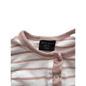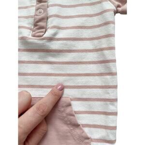 Little Bipsy blush stripe pocket romper. Soft and stretchy. Listed in good condition for a small, super faint spot (see last pic). Size 2t-3t, but fits like 24m/2t in my opinion. 95% cotton, 5% spandex.