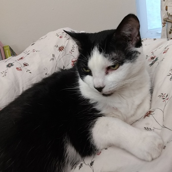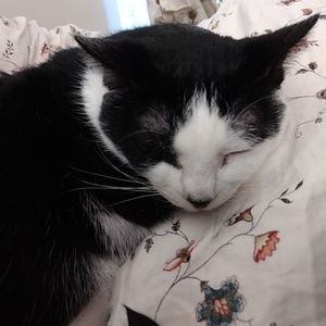 Vibrates when happy, demands food and cuddles. Will only sit on a lap if there is a blanket. Doesn't like Bombays. Rubs face on books. Doesn't like people taking baths.