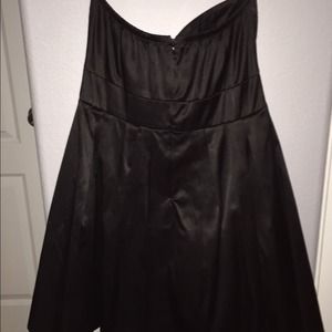 A satin black dress with a sweetheart neckline. Has tool underneath to give the dress volume. This is a fun party dress to wear to a dance, wedding or a special occasion.