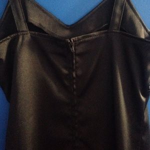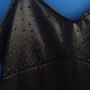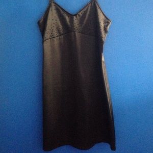 This dress is very sexy and slimming. It's made of a satin-like material but looks like leather. There is a zipper down the back and subtle beading on the front. This dress is in perfect condition and can be dressed up or down!