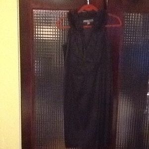 V-neck with subtle shimmer, fur and ruffled collar. The fabric has a mildly silky appearance.