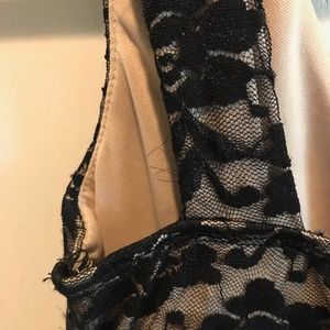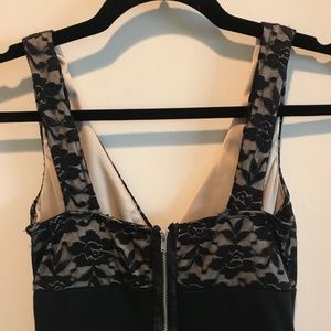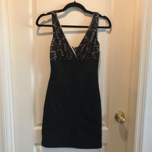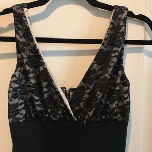 This is a great little black dress. Great for date nights and special events. The top has black lace and is in great condition.