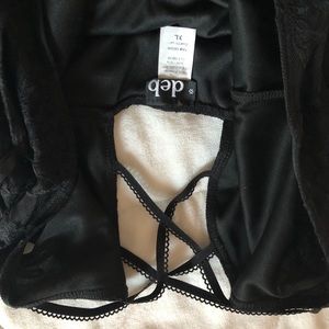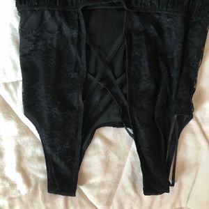Little Black Dress. 100% polyester. True to size. Super comfortable. Thick straps and cris cross back. Only worn 3 times. I’m 5’9 and length went to about mid thigh.