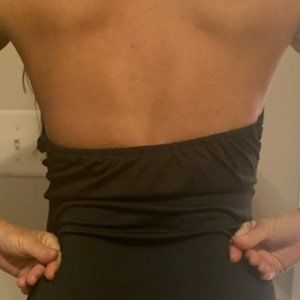 Cross front, open back, knee lenth, size Med. Fabric fits all body types perfect. Every girl needs a little black dress.