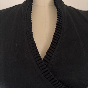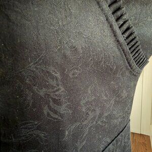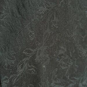 This is a super cute black dress. Thick fabric that has a print that I'm not sure if you would call it embroidered? or pressed? It's super flattering for medium/large chested ladies. Beautiful neckline. I love this dress and wore it often. It's held up beautifully.