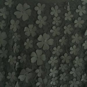 Karl Lagerfeld Little Black Dress covered with black daisy appliques, size 6, lined, sleeveless, zipper back with 1 pearl like button. Shell is 50% rayon ,25% cotton, 25% nylon, lining is 100% poly. Extra back button included.