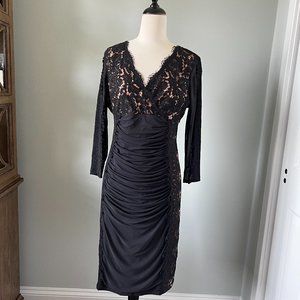 Meta Description: The Little Black Dress is a stretch lace and jersey dress with eyelash lace and power mesh ruched V neck. This fitted knee-length dress has a hidden back zipper and 3/4 power-mesh sleeve with lace overlay.