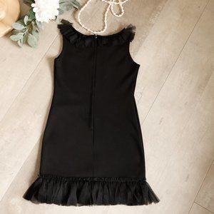 This Girl's Boutique Little Black Dress is the epitome of Chic!! A Little Black Dress with extra PIZZAZZ!! The fitted dress is made of comfortable stretch, no-wrinkle blend that is sure to keep your girl comfy for her entire event. The simple silhouette is sleeveless and has a high-fashion tulle neckline. The upper bodice is adorned with multi-colored faux jewels that add a pop of color to this dramatic little black dress. More jewels adorn the bottom of the skirt and the hem doesn't disappoint with a 3.5 inch straight tulle ruffle, giving a feather-like appearance. The back has a zipper closure. The front of the dress is lined for comfort. Great for recitals, homecoming dances, Daddy/Daughter Dances, weddings, parties, and other special occasions. What a dashing little black dress!! Worn Once- Like New
