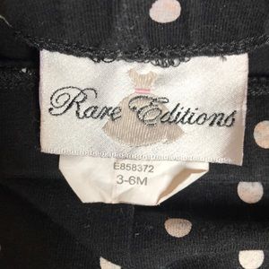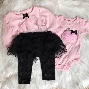 Pink and black lace 3-piece outfit (3mo), “little black dress” onesie, black polka dot leggings and pink layering top. EUC! Smoke free home.