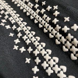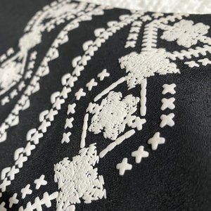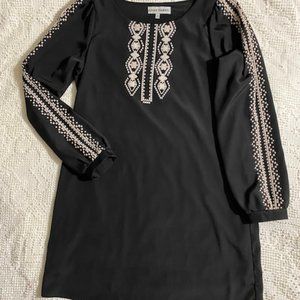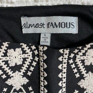 This Almost Famous LBD has lost its tie belt, but has a great loose fit. The faux cream-colored embroidery gives it a fun Boho Vibe. I loved wearing this dress with boots and big earrings. It is a Junior size Large, but fits like a Women Medium. The hem hits above the knee, wear with your favorite belt for a shorter look. The dress is lined, the sleeves are not. The sleeves do not have elastic. Best of all, it's Machine Washable!