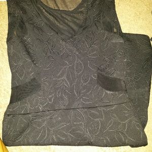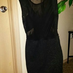 Black Mini Dress with floral print on the solid material and a Sheer Material Bust Top, The back is also Sheer.