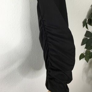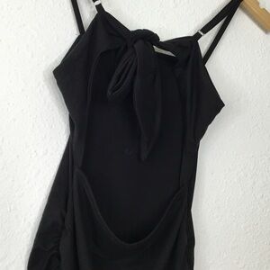 An all black dress with a square neck and ruching down both sides. Thin, soft material. Perfect for a girls night out. Adjustable straps with an open tie back.