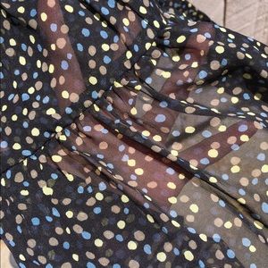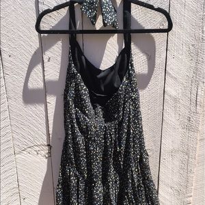 Halter Dot Mini dress with front gathering detail below bust. Ruffle layer at bottom of dress that wraps around to the back. Back has elastic gathering for extra give for all that dancing. Cute small Polka-Dots (Blue, Taupe and Lime dots). Cute for any party day or night. Semi-Sheer in lightweight. •Size XS •Color:Black •Fabric Content: 100% Silk Lining: 100% Polyester (in good condition)