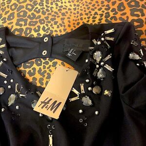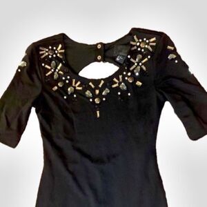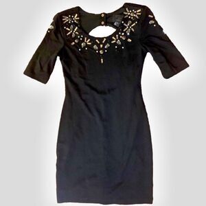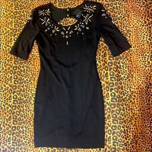 Size 4 NWT Gorgeous little black dress with silver & black jewels along the neckline and keyhole back. It is a kovely dress that’s fully lined and suitable year round. She’s demure in the front and sassy in the back.