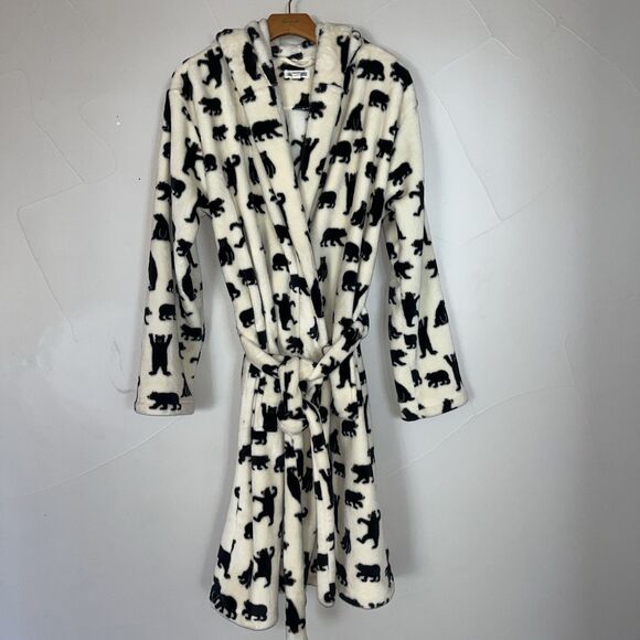 Cabin feels in this plush robe. Fleece is incredibly thick and soft, quality! Black bear pattern, excellent preowned condition, no signs of wear.