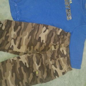 Two piece 'LITTLE BROTHER ' Outfit. Includes a long sleeved onesie and camo pants.