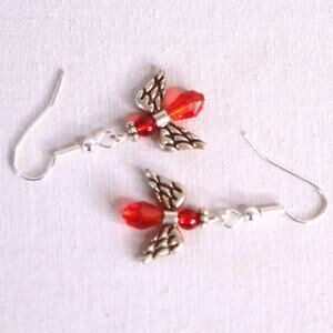 Little Dangling Angel Earrings Pierced Red Faceted Stone Silver Tone