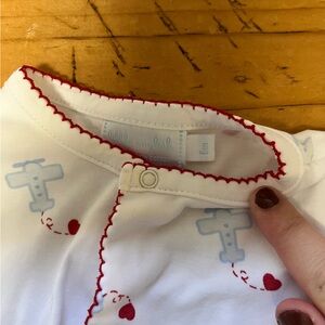Adorable footie with charming light blue and red print. Snap closure for easy dressing. Ideal for cozy wear.