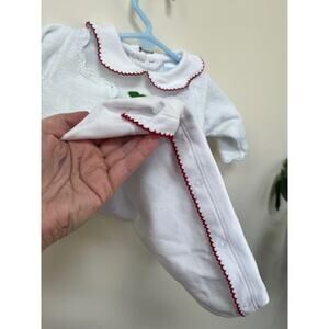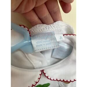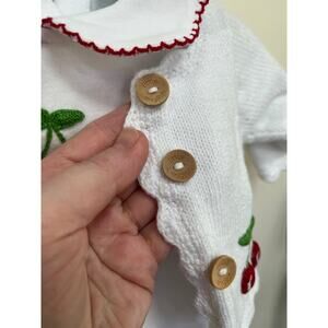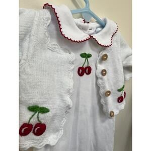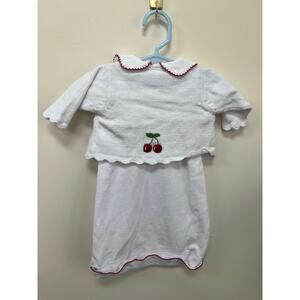 Little English set. Cherry motif. Gown retails for $62, sweater retails for $82. Such a perfect and classic infant set. Wooden buttons on the cardigan. Very gently worn by one baby. No stains or damage to note. Sweater is size 3 month. Gown is 0-3 month. Darling Peter Pan collar with red trim.