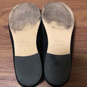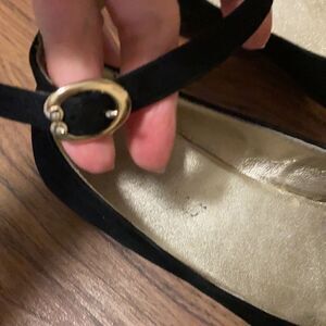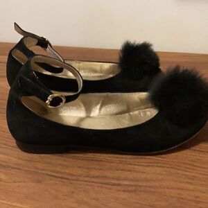Little Eric black suede ballet flat with ankle strap and plush mink pompom. Gold tone buckle closure with 2 rhinestones. Preowned with some rub off spots on the inner shoe lining. See picture. Otherwise in excellent condition. EU size 35. US size 5. Made in Italy.