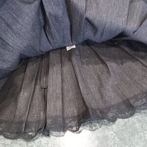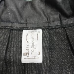 The product is a size XL black pleather skirt with straps and silvertone handcuffs by the brand Little for Big. This mini skirt features a zip closure and a unique design perfect for various themes such as festival, biker, punk, grunge, metal, gothic, and Halloween. The lightweight skirt also includes crinoline accents, adding a touch of flair to the overall look. Ideal for women looking to make a bold fashion statement with a blend of edgy and dark elements in their wardrobe.