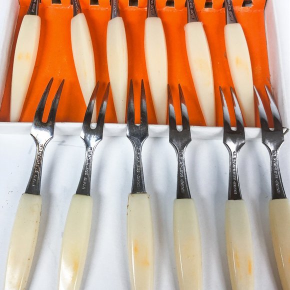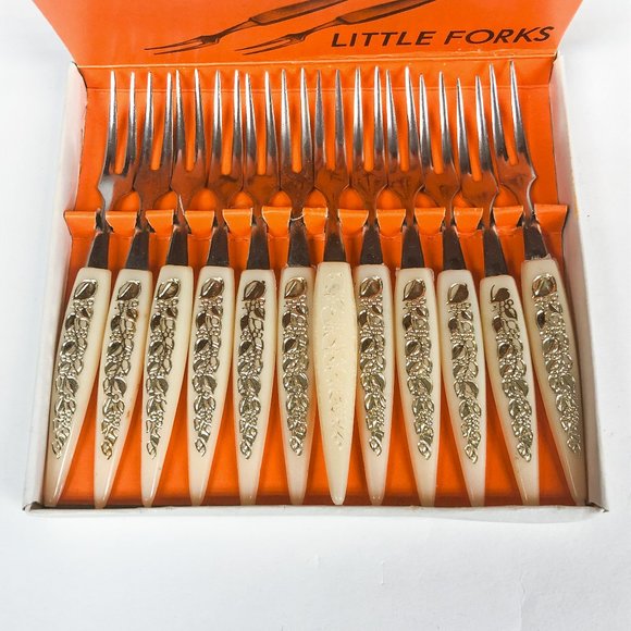 Vintage Box of 12 Mini Stainless Steel Little Forks. Each fork is approximately 4” long. Used, in overall great condition except for one fork which has the gold pattern rubbed off. The box has some wear to it but not bad. See all photos for details. Colors may vary by screen.