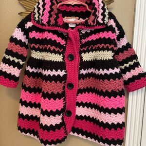 Beautiful pink black purple colors! It’s really darling! Size 18-24 months. Cleanest home! I feel it’s more like a little coat and will list as such.