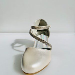 Designed with Leatherette upper, round toe, rhinestone accent, padded insole, low covered heel and jeweled cross strap with adjustable buckle.