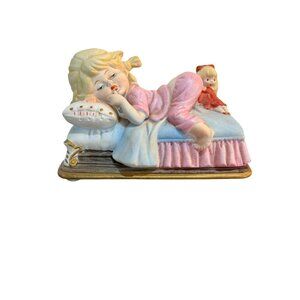 This ceramic figurine features a young girl in pink pajamas lying on a bed with a doll. A charming decorative item for collectors or gifting.