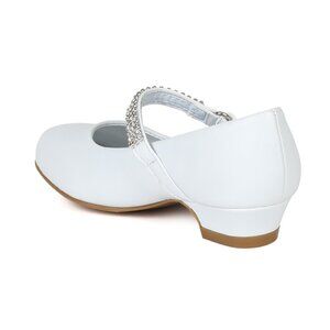 These stylish, comfortable, and match all jeweled kittie heel pump is designed with a PATENT leatherette upper, round toe, rhinestone encrusted hook and loop strap for easy and tight closure, chucky and low kittie heels, extra padded insoles. These shoes will complement any legging or dress for your beautiful little princess!