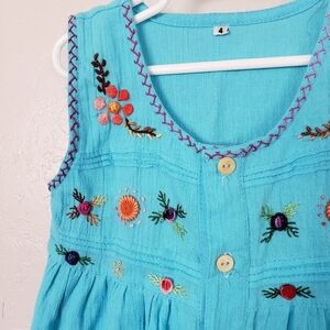 Little Girls 4 Bright Blue Sleeveless Mexican Embroidery Dress Button Up Flowers