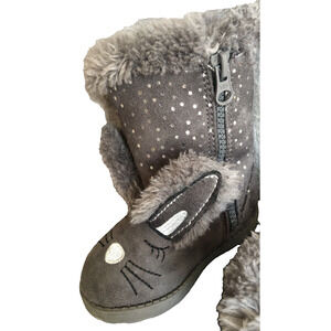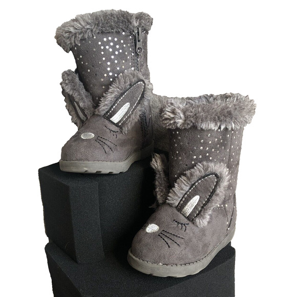 Cat & Jack Little Girls Bunny Half Calf Faux Fur Lined Boots with Ears in size 5. Round toe, zip closure, moderate cushioning, made of fleece fabric and have a faux leather outsole. Features fur trim, glitter, and studded accents and have a bunny character. Boot measures 6" in length