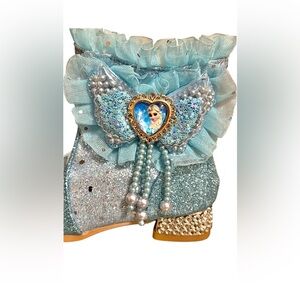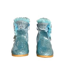 Adorable Elsa boots in sparkly blue. Features ruffles and a decorative heart detail.