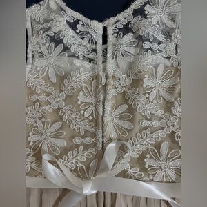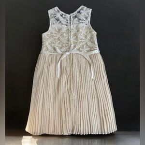 Charming cream dress with lace bodice. Perfect for formal events. Pleated skirt adds elegance.